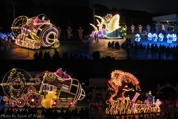 到了晚上我們坐在觀賞區觀看,在 晚上花車上的燈光效果真的很讚! !