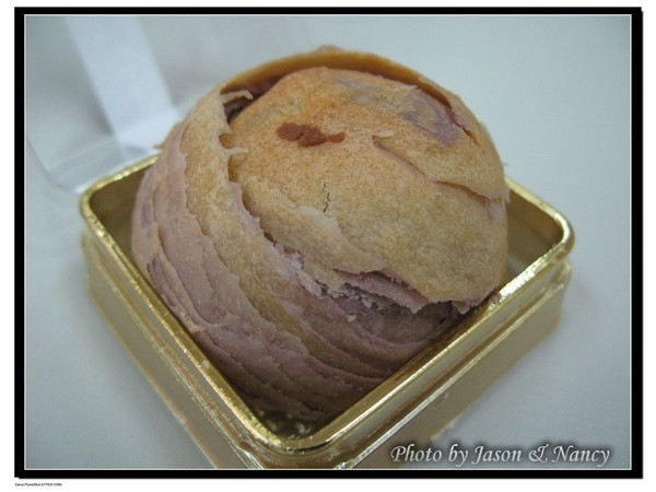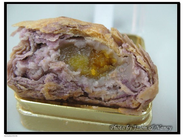 它的內餡有芋泥、麻薯、蛋黃,一口咬到全部時,在嘴巴裡會有種甜中帶點鹹的口感,加上芋泥的香味,真的很好吃。
